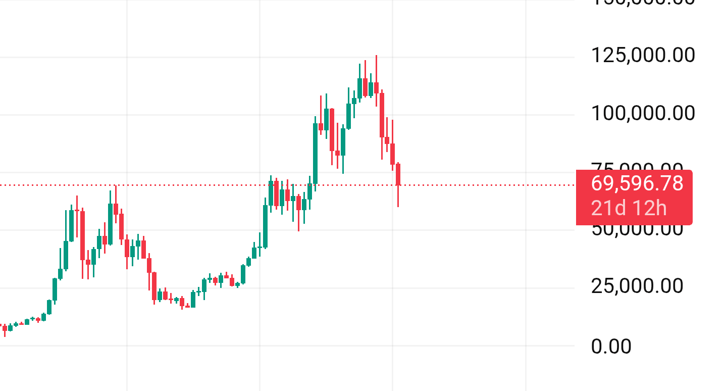 The weekly candle shows a strong rejection wick from the 75k region. This indicates heavy selling pressure at higher levels. BTC is now testing support from the previous 2024 highs.
