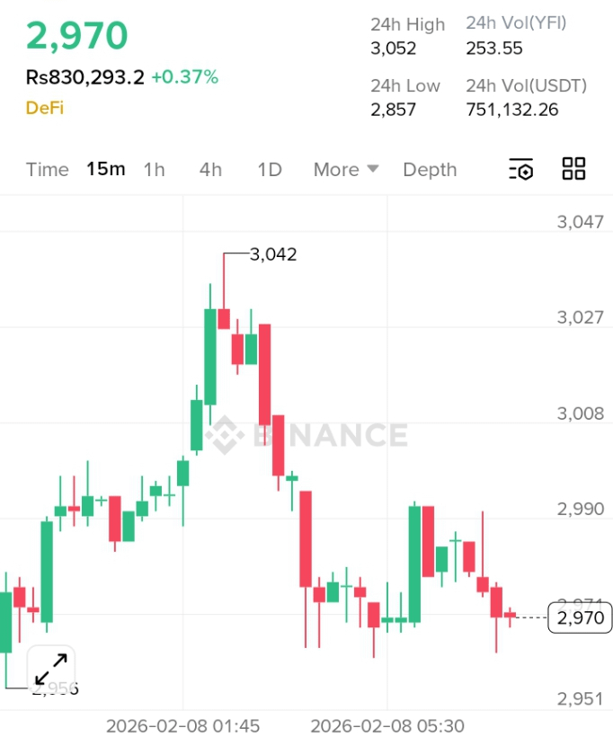 ​The chart shows Yearn.Finance ($YFI ) trading at $2,973, struggling to maintain momentum after a brief spike toward $3,042. While the 24h change shows a slight green (+0.51%), the broader trend highlights significant pressure.