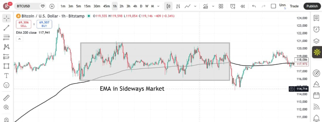 Caption: “Chart 1 — EMA in a sideways market: price repeatedly crosses the EMA 200, creating confusion and fake signals.”