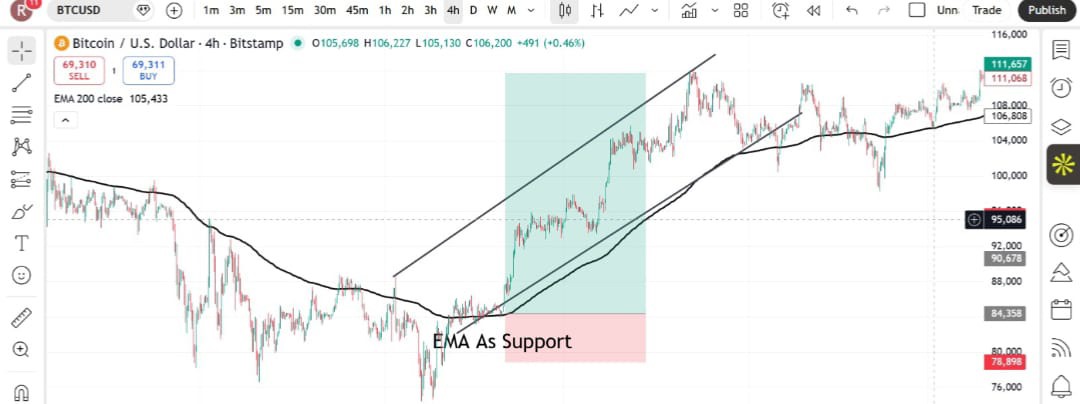 Caption: “Chart 2 — EMA as support: once price is above EMA 200 and trend builds, dips toward the line often get bought.”