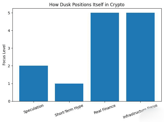 Dusk positions itself in crypto as more than just another blockchain project. It focuses on bridging the gap between real-world finance and decentralized technology. While many projects chase hype and speculation, Dusk builds tools that are practical, compliant, and ready for institutions to use.