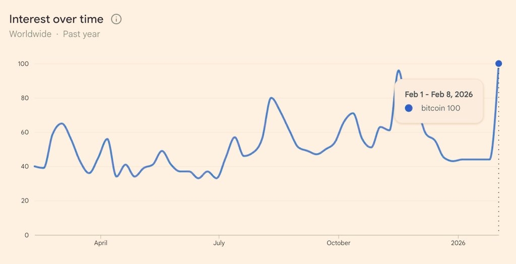De acordo com o Google Trends, o interesse em buscas por $BTC disparou para uma mĂĄxima de 12 meses no inĂcio de fevereiro de 2026. O pico coincidiu com a queda acentuada de $81.500 para perto de $60.000 em apenas cinco dias, seu nĂvel mais baixo desde outubro de 2024.
