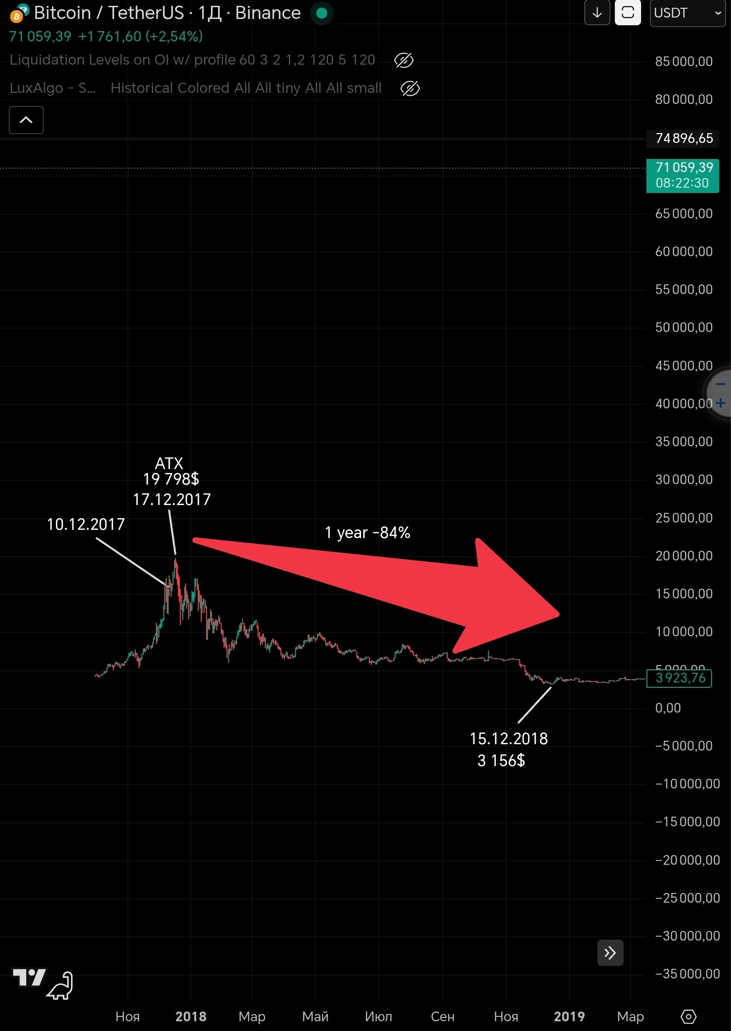 С этой точки началось мучительное и долгое падение. Ровно через год, в декабре 2018 , цена рухнула до $3 156. Падение составило 84%. На мой взгляд, связь здесь прямая: крупные игроки получили инструмент, позволяющий обваливать рынок, не владея ни одной монетой.