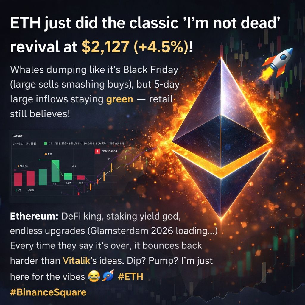$ETH #Ethereum✅ #ETHEURUM #Market_Update ETH just did the classic 'I'm not dead' revival at $2,127 (+4.5%)! Whales dumping like it's Black Friday (large sells smashing buys), but 5-day large inflows staying green — retail still believes!
