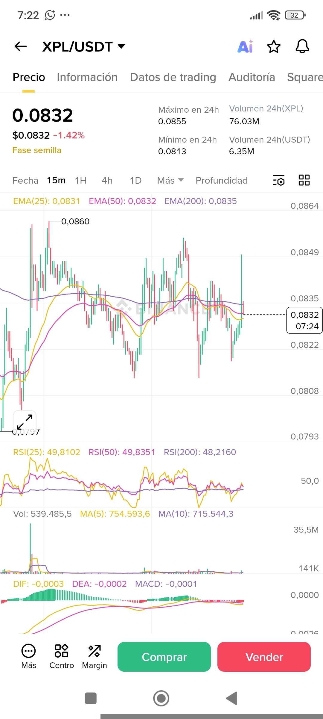 Chicos, $XPL ha estado pasando por unos días difíciles, pero parece que quiere volver a la pasarela. Tras tocar fondo, estamos viendo una pequeña reacción alcista. Sin embargo, no nos dejemos engañar por el primer brillo; la verdadera fiesta empieza cuando logremos cerrar con fuerza por encima de la EMA 200 (0.0835). 💄