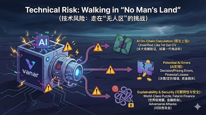 1. 太新了,稳不稳? 将AI计算原生上链,这事本身就没被大规模验证过。Vanar的AI引擎在极限情况下会不会出bug?效率如何?都需要时间来证明。这就像第一代电动车,理念很酷,但续航、安全都需要市场检验。