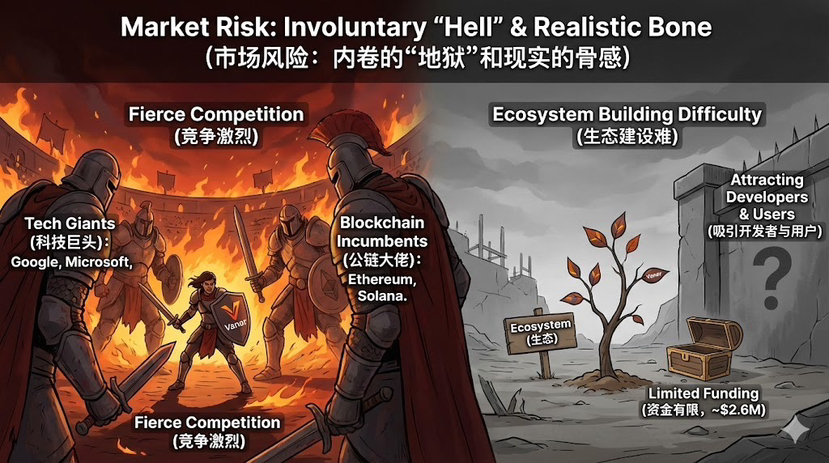 1. 竞争太激烈了: AI+Web3是兵家必争之地。外面有谷歌、微软这样的科技巨头虎视眈眈;内部有以太坊、Solana这些公链大佬随时可能发力,通过收购或自研,快速补齐其在AI领域的短板。Vanar就像一个有独门武功的少年,但要面对的是整个江湖的顶尖高手。
