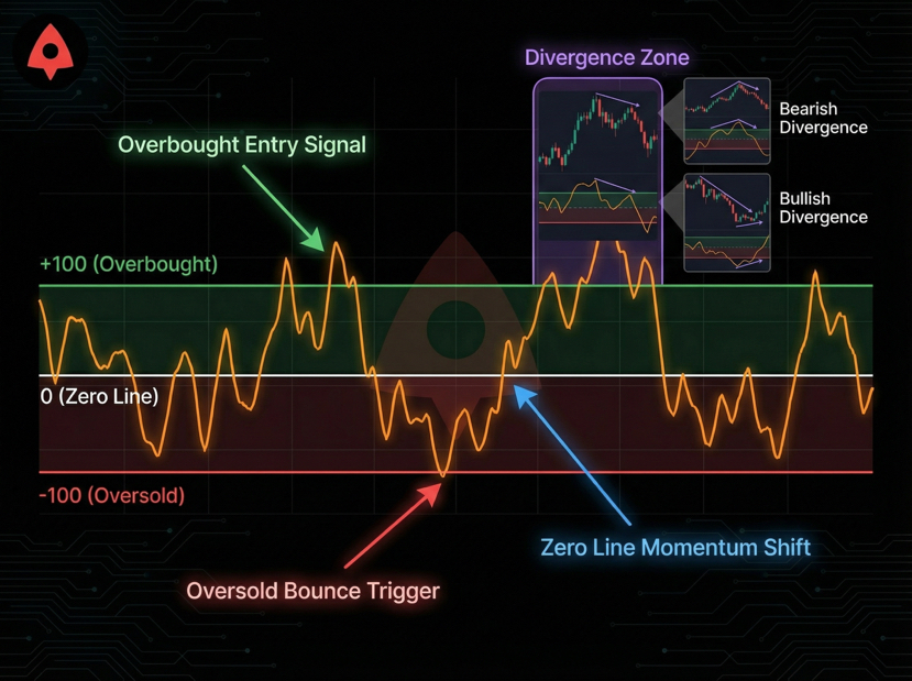 Price-C CI divergence is a high-value signal among experienced traders. Bullish divergence forms when price hits new lows while CCI prints higher lows-an early clue that downside momentum is weakening. Bearish divergence occurs when price makes new highs but CCI fails to surpass prior peaks, warning of weakening upside thrust.