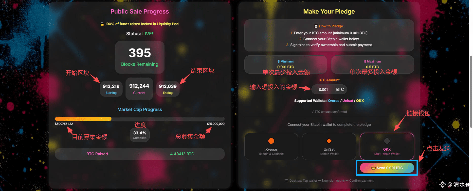 操作流程:点开打新链接,右边中间输入需要打的BTC金额,接着会出现Unisat等钱包,链接钱包后,下面会有一个Sent BTC,发送即可。