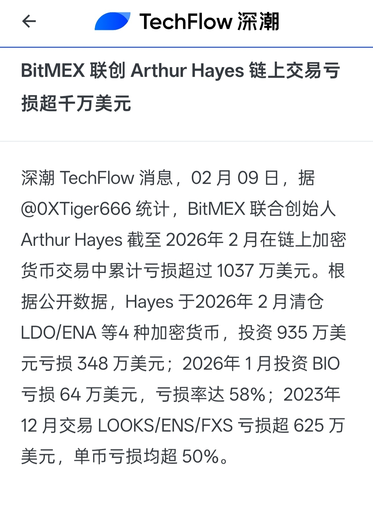 刚刷到炸消息!BitMEX联合创始人Arthur Hayes,链上交易居然亏了超1037万美元😱