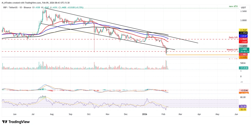 Ripple ($XRP ): Trading at $1.44, testing the broken falling wedge lower trendline. Upside to $1.83 if it reclaims? Downside risk to $1.30 weekly support. Momentum indicators flashing red â traders, stay vigilant! đ #XRP