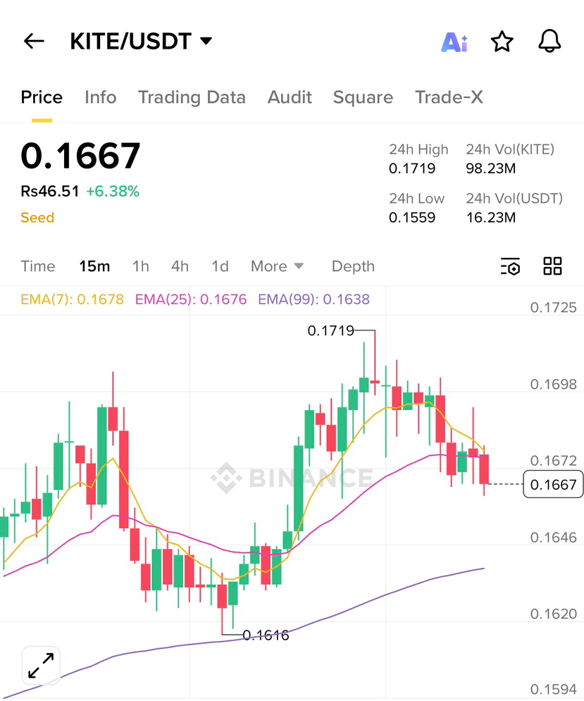The KITE/USDT pair is currently showing some high-stakes drama on the 15m chart! While the price is sitting at 0.1667 (up over 6% today), weâre seeing a classic battle at the EMA(7) and EMA(25) resistance levels. After hitting a local peak of 0.1719, the bulls seem to be catching their breath as the price dips back toward the EMA(99) support near 0.1638. If we can hold this ground, we might see another leg up, but a break below could signal a deeper cooldown. Keep a close eye on that volumeâit's decent, but we need more "oomph" to reclaim the highs. Trade smart, set those stops, and don't let the volatility shake your plan! đđ
