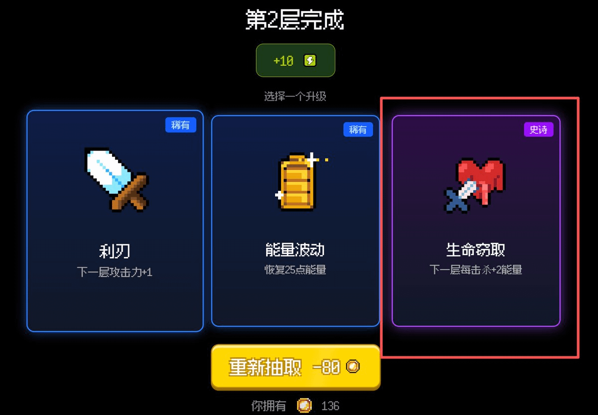多购买几把没用,死了不会原地复活,每层选择的时候建议多抽几次,争取抽到史诗。