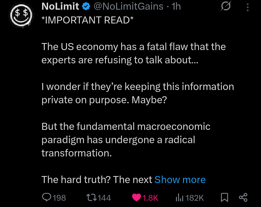 $BTC A recent thread by Institutional investor NoLimit argues that the next U.S. crisis won’t look like 2008. Instead of a global financial contagion, he suggests a more localized U.S. stagnation driven by sovereign debt pressure, sticky inflation, commercial real estate stress, and shifting global capital flows.