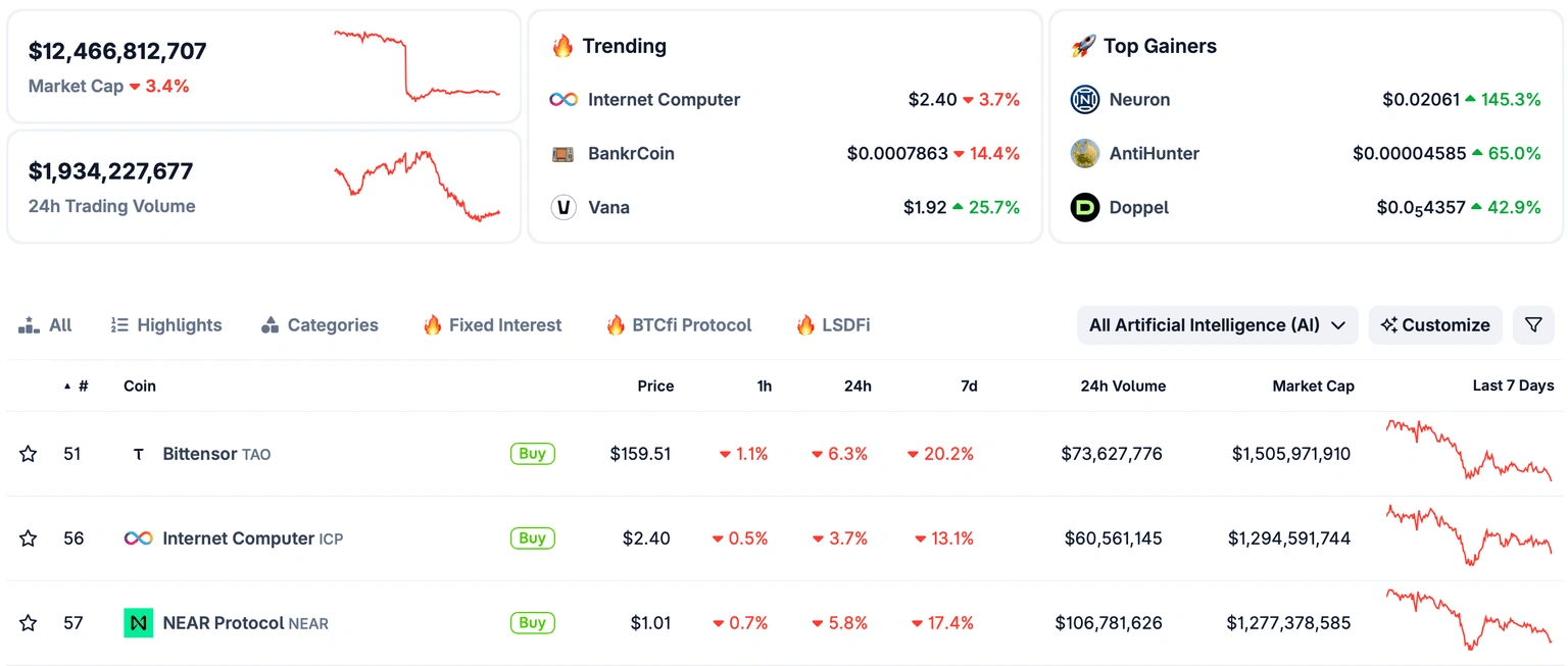 Artificial Intelligence (AI) coins, including Bittensor ($TAO ), Internet Computer ($ICP ) and Near Protocol (NEAR), are trading under heavy headwinds as risk-off sentiment spreads across the crypto market. The segment's total market capitalization has declined by 3.4% over the past 24 hours to $12.5 billion, undermining potential buy-the-dip opportunities.