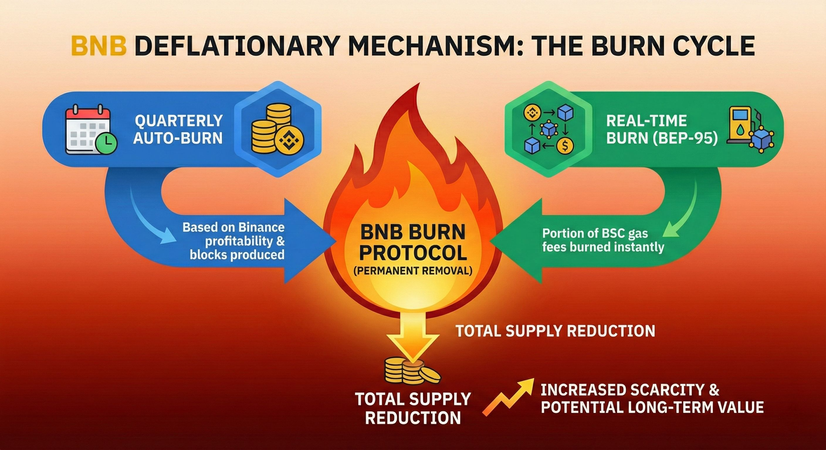 Quarterly Auto-Burn: Each quarter, Binance uses a portion of its profits to buy back and burn BNB. The amount burned is calculated based on the BNB price and the number of blocks produced on the BNB Smart Chain during the quarter. This process will continue until 50% of the total BNB supply (100 million BNB) is removed from circulation.