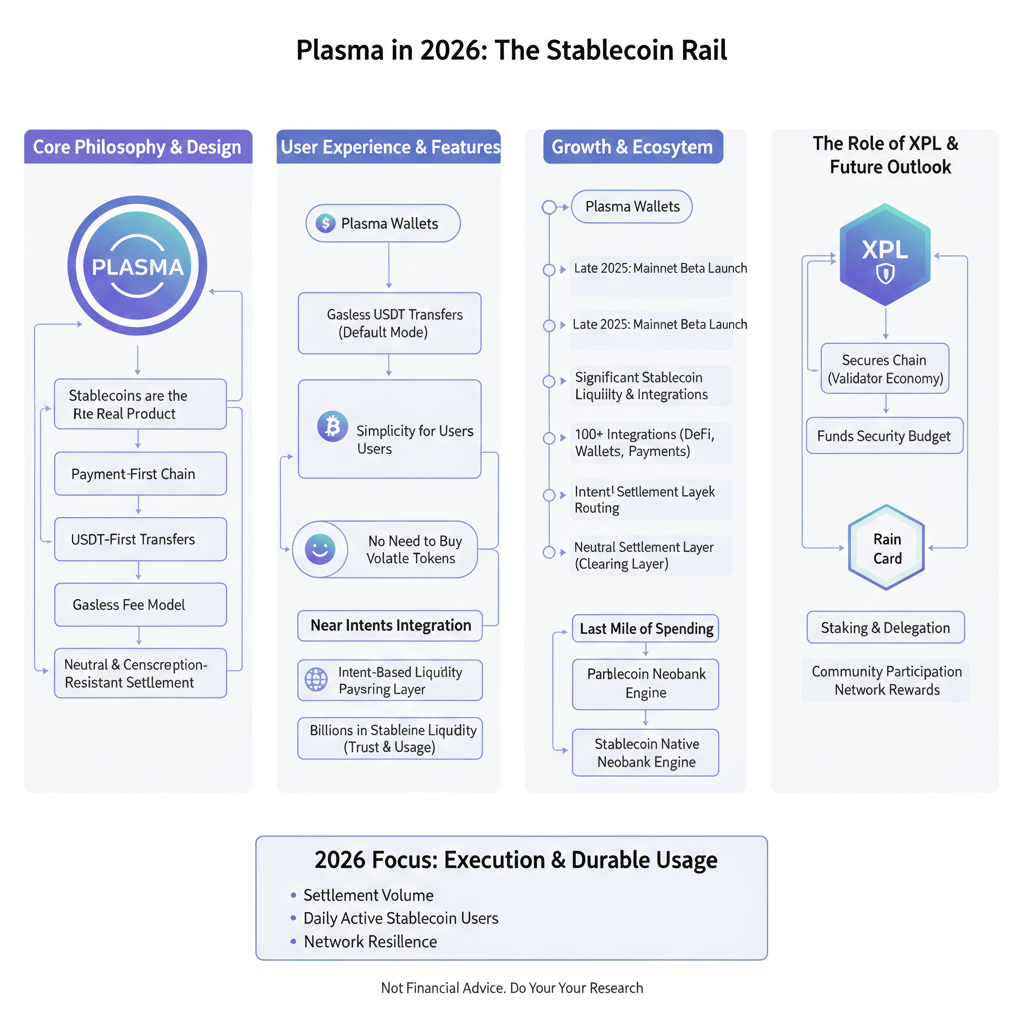 The next phase is execution. Plasma spent the last two years building launching and integrating. Now it has to show durable usage. The year 2026 will be measured by settlement volume daily active stablecoin users merchant adoption and network resilience during volatile markets. The building blocks are already in place. Gasless USDT is live. Bitcoin anchoring gives a clear security narrative. DeFi and payment integrations grow every month. Intent routing brings multi chain liquidity together. Staking strengthens validator economics. What the network needs now is time consistency and real world usage data.
