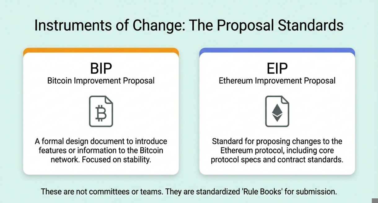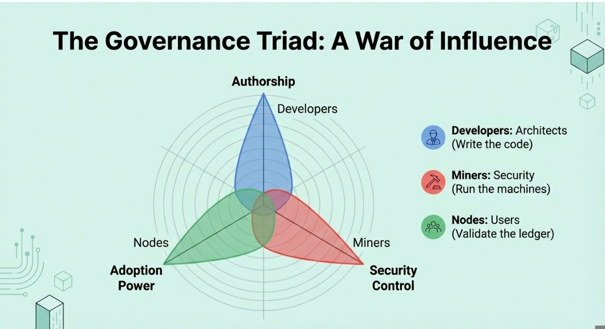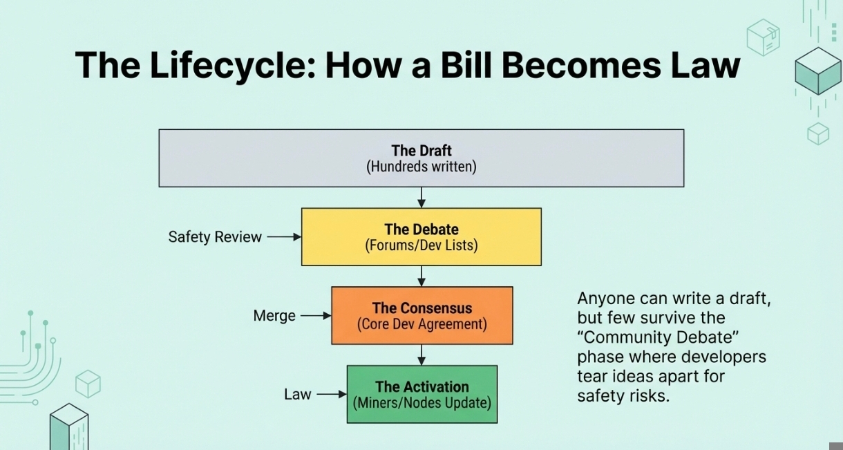 • โ€‹The Miners (The Security): They run the expensive machines. If they don't like the new rule (BIP), they simply refuse to install the update. The new code dies.