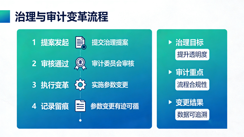 4. 明晰治理与审计:变革不再依赖隐秘的多签密钥,而是可通过清晰的治理提案进行,所有参数变更都有迹可循,为机构提供了所需的可审计性与确定性。
