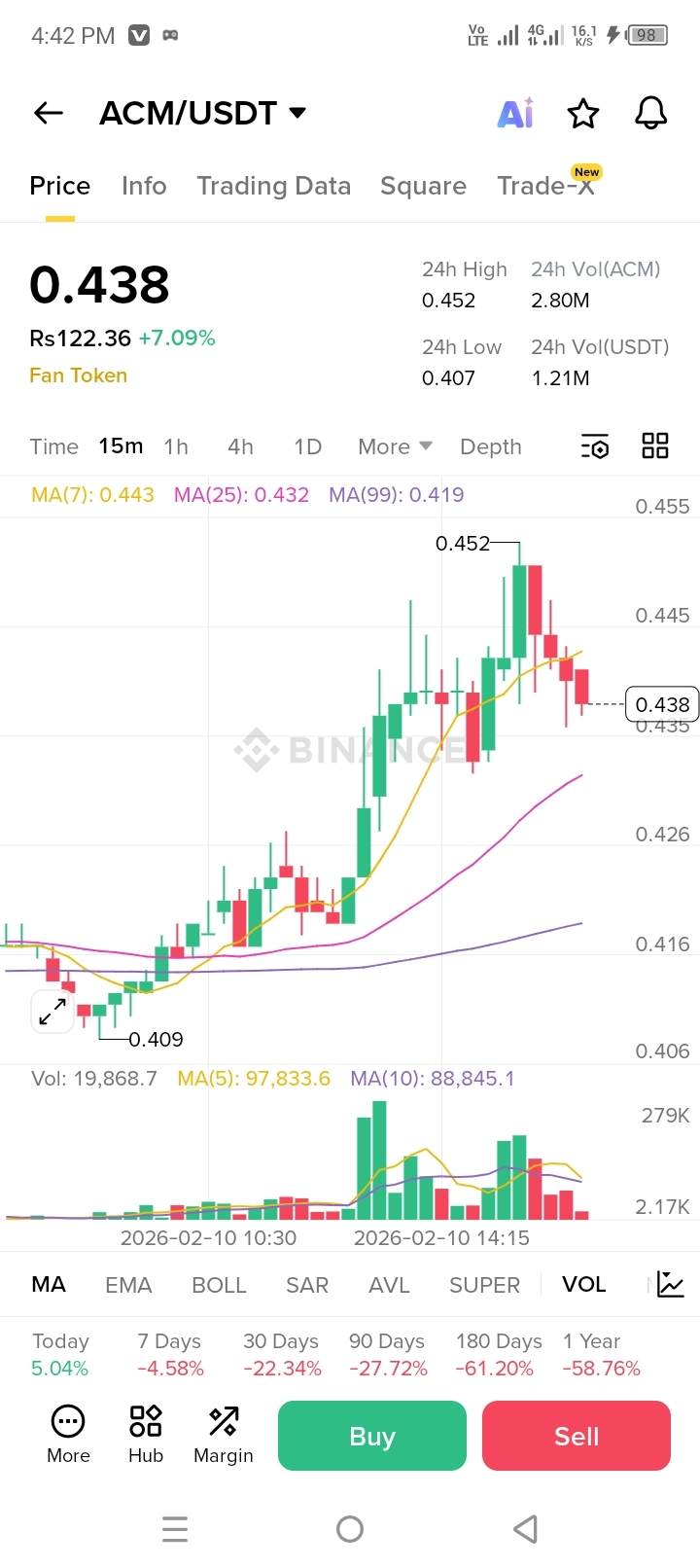 The $ACM Milan Fan Token (ACM) is currently trading at approximately $0.438. The chart displays a solid recent rally, with the price moving upward from a low of $0.409 and reaching a high of $0.452.