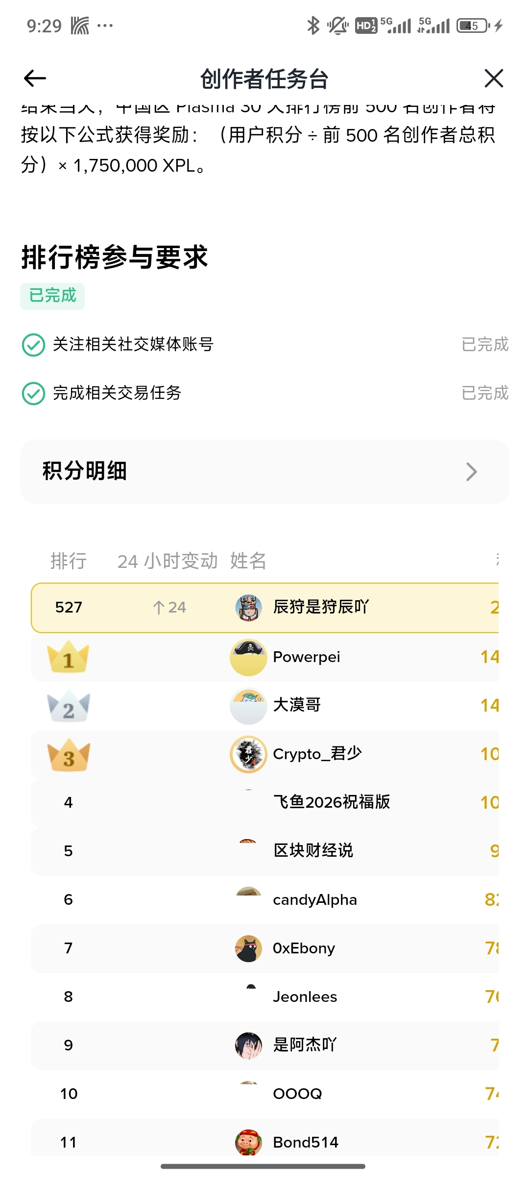 1月12日xpl嘴撸就结束了 只能等下一个前500榜奖励继续做了 前100的要有粉丝基础 流量才能做 普通人要想得吃只有前500的榜 这一个月xpl我现在是榜522 不知道接下来这几天都做能不能赶上 希望给我个爆单 给我送进去 做的方法1每天刷1000➕交易量给5分 2 推特发文➕5分 3 币安广场发文 币安广场发文只要有流量就可以不一定要写推广文也可以写其他内容的然后打上标签 只要有流量 系统会给你算分的 基本300浏览量是4分 所以每天差不多是18分左右 进入榜的分是24天的 只要每天都刷15分 300分以上是稳吃肉的 嘴撸的肉大概在100u左右 大概24天吃一波 基本没有成本 每天都得打卡 现在刚开始肉挺大的 比alpha还多 alpha要拿不少本 这个嘴撸基本不需要什么成本 就是得坚持 有粉丝量的很好搞 新手号就得努力搞了 我大概从600名一直追 只要每天拿到18分可以稳住当前排位 20分以上就是追分的 还剩2天让我们继续加油 等下一个项目出来的时候从第一天就开始嘴撸 是可以稳吃的 我前面空了大概一周的样子导致现在我还得追 后面拿不拿的到还得看这几天有没有爆分 没爆分基本稳不到了 等下一个前500榜单再努力吧 第一天就开始嘴撸是稳的 #plasma