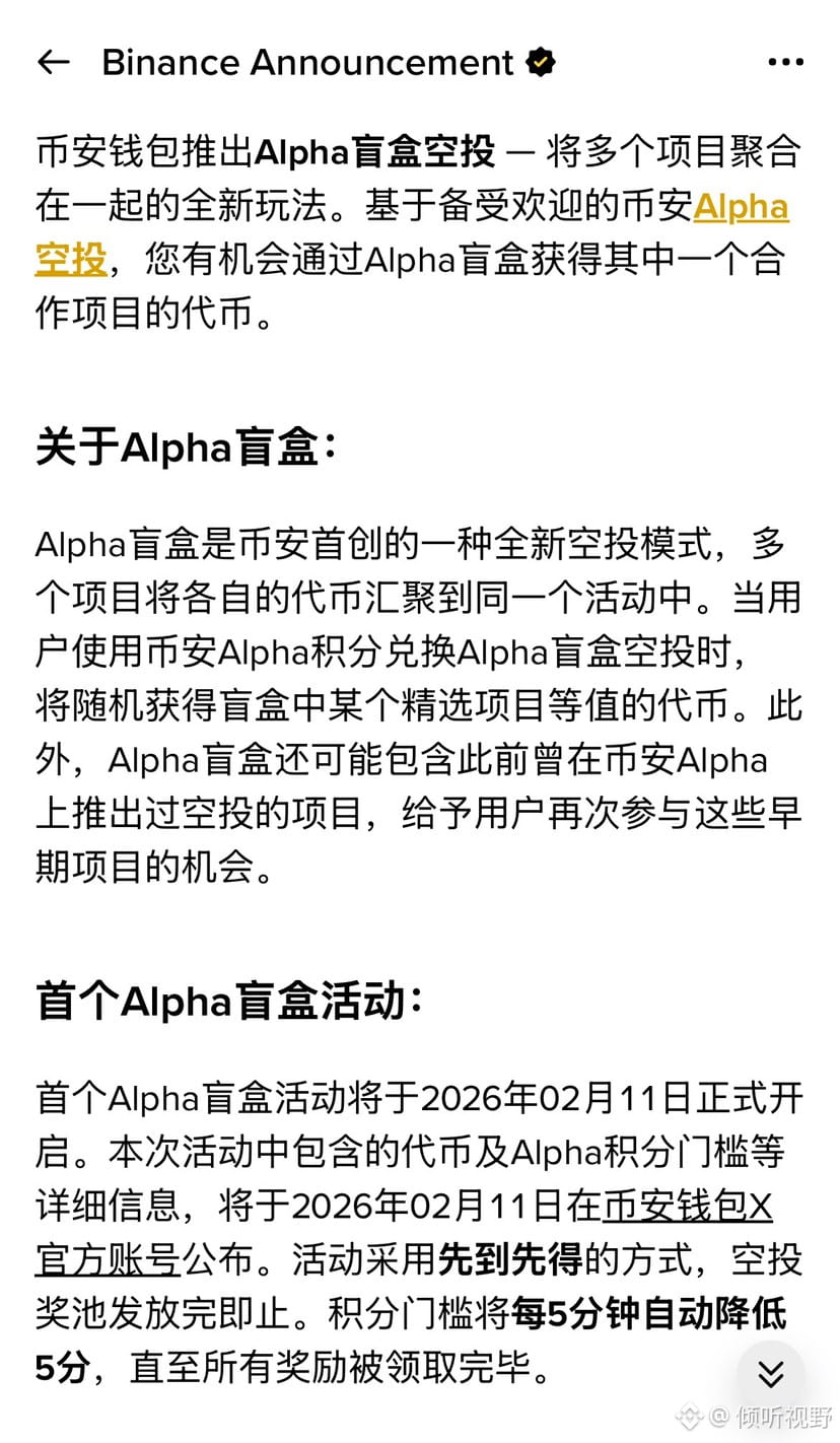 等2 月 11 日,Alpha 盲盒上线那一刻,真正参与的用户会很清楚地意识到一件事——这不是你在陪币安玩活动,而是币安在教整个行业,什么叫 Web3 用户增长的正确姿势。