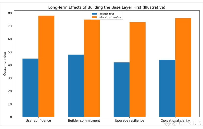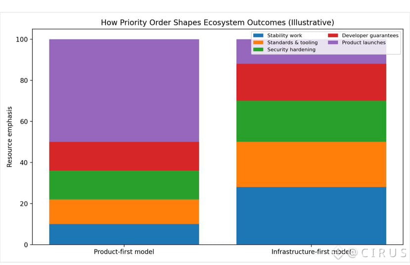 The alternative approach is familiar. Launch products early, gather attention, then retrofit stability as problems appear. This can work for a time. But retrofitting is expensive. Every adjustment risks breaking continuity. Developers hesitate to build deeply because foundations keep moving.
