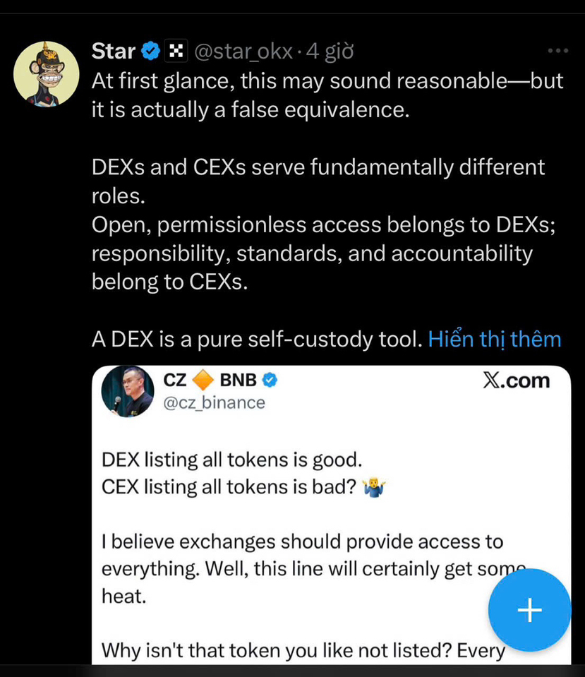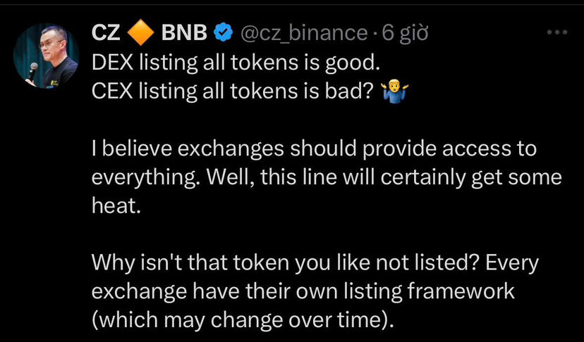 Trích dẫn bài đăng trên X của CZ về CEX và DEX