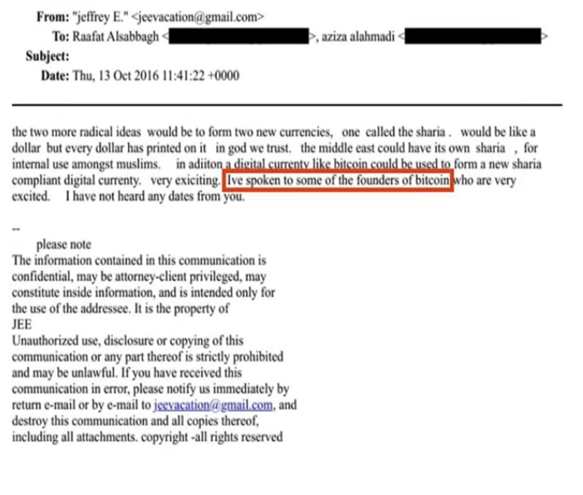 In 2016, Epstein emailed partners in Saudi Arabia proposing ideas around regional digital currencies and religion-compliant crypto systems. He claimed to have spoken with “the founders of Bitcoin” — without providing evidence. Many believe this claim was intended to enhance credibility with prospective partners.