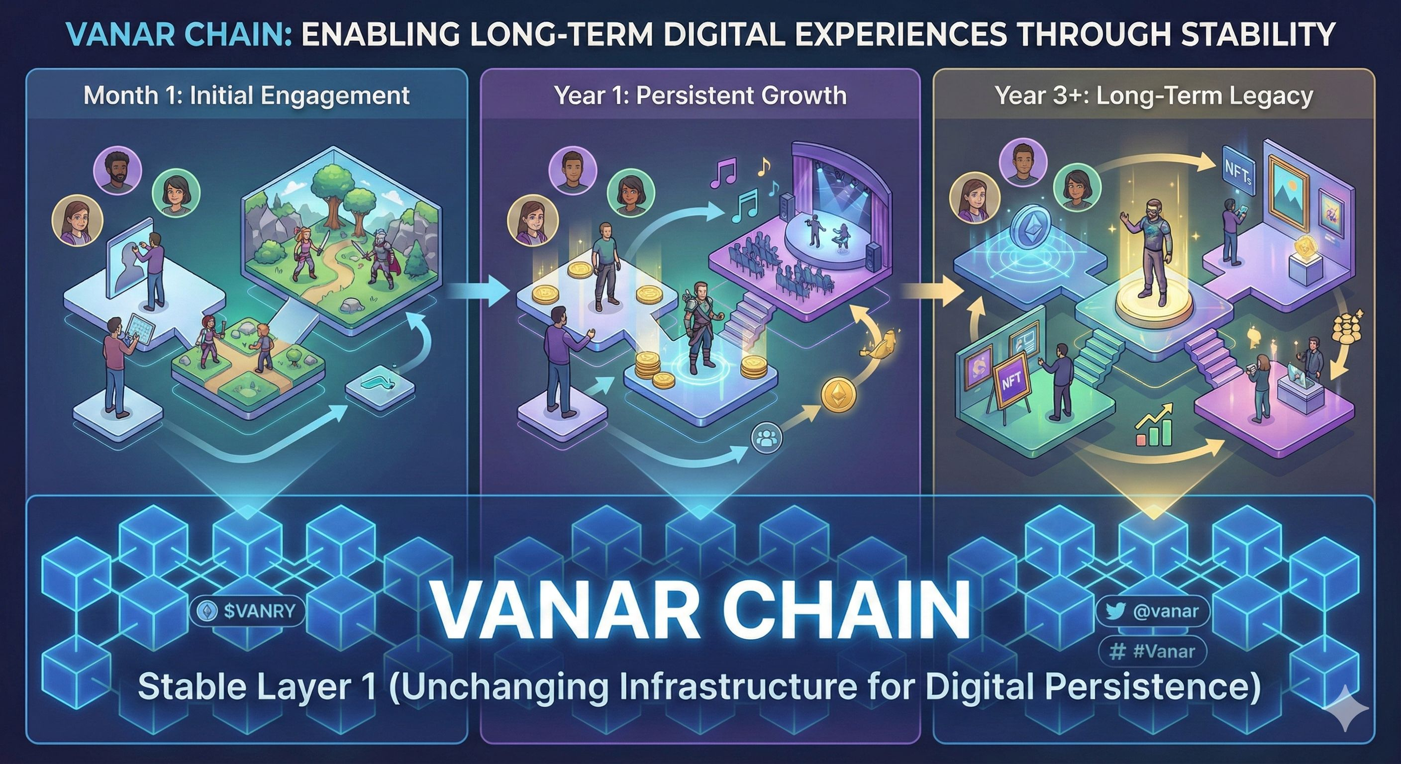 Vanar is a Layer 1 blockchain built for real world adoption across gaming, entertainment, virtual environments, AI powered platforms, and brand ecosystems. These sectors depend on persistence. Players invest time in games, communities form around digital spaces, and brands build long term relationships with audiences. Through the project account @Vanarchain , the operational role of the $VANRY token, and the wider vanar ecosystem, Vanar positions itself as infrastructure designed to support digital experiences over years, not cycles.