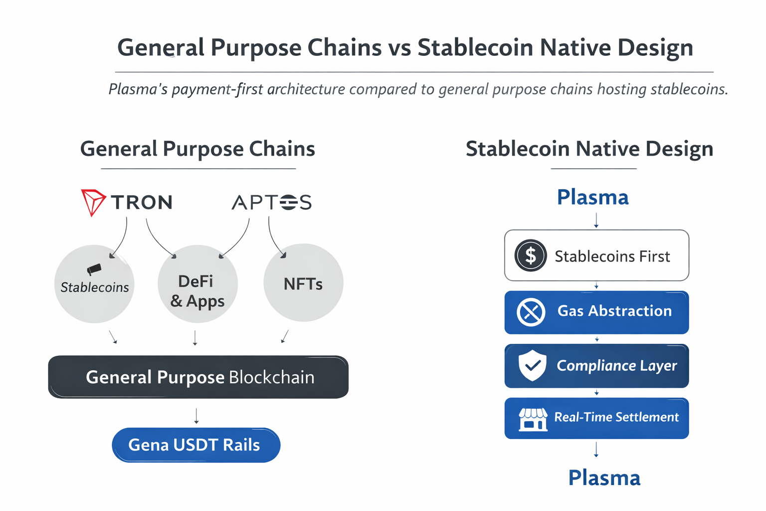 Plasma’s payment-first architecture compared to general purpose chains hosting stablecoins.