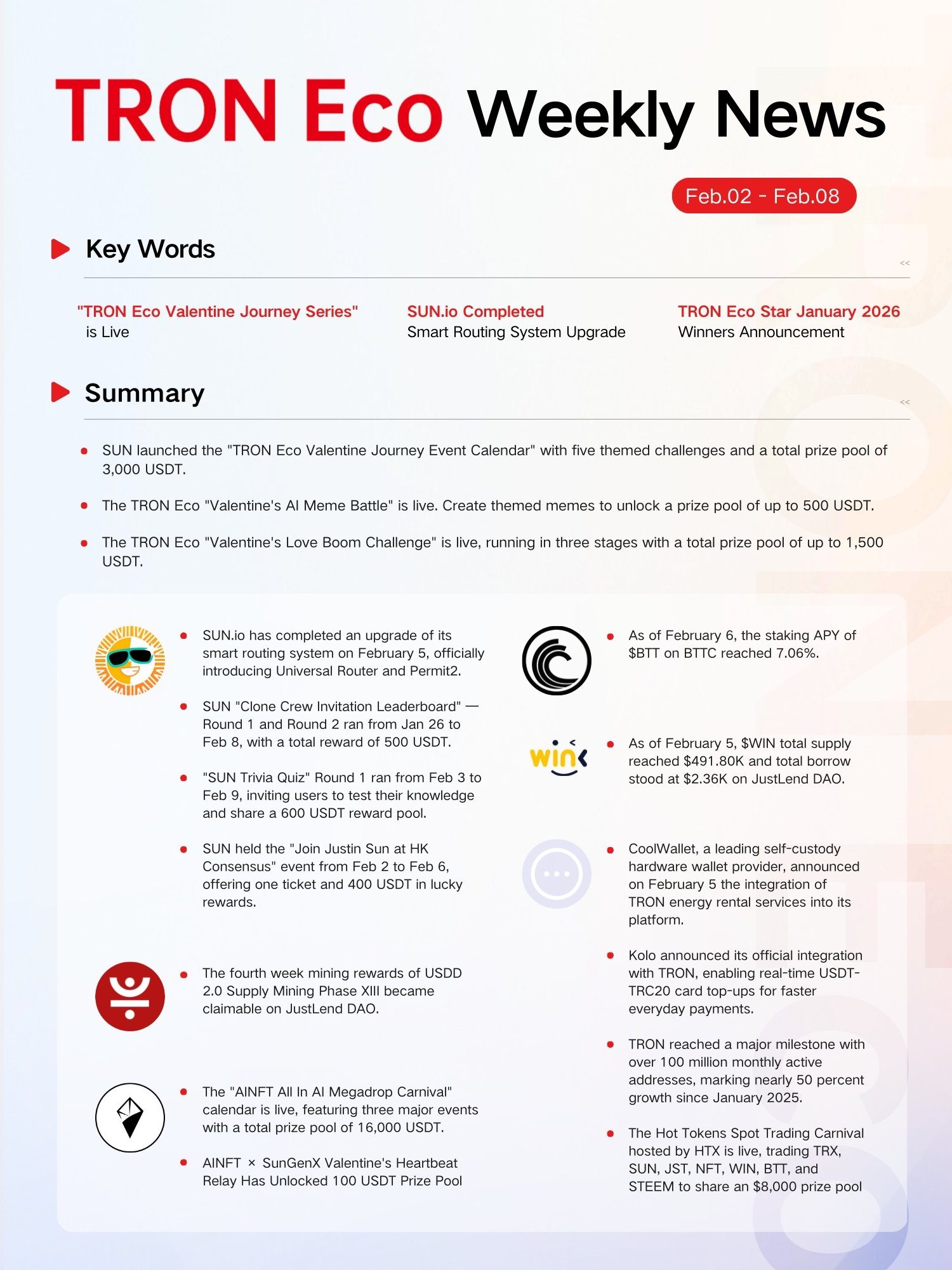 • SUN Trivia Quiz Round 1 (Feb 3 – Feb 9) featured a 600 USDT pool