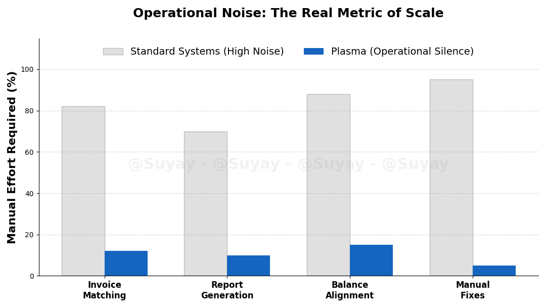 Figure 2: The Operational Noise Spectrum. A benchmark of the manual friction inherent in standard payment rails versus the "operational silence" of Plasma. Reliability is measured by the absence of manual intervention after funds have moved.