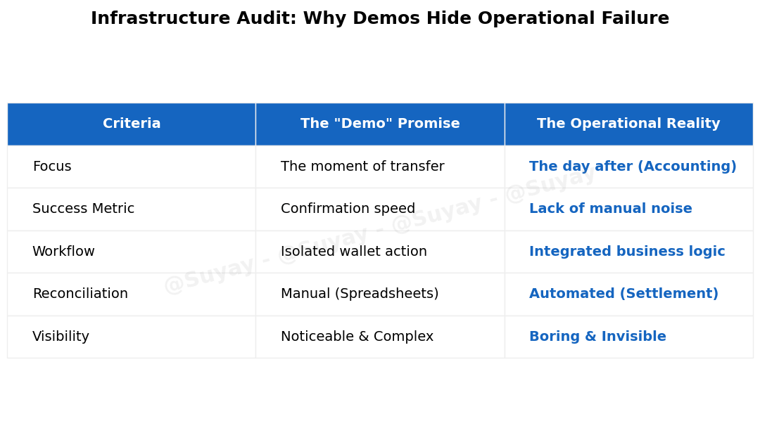 Figure 3: Operational Audit Matrix. Contrasting the superficial features shown in technical demos against the real-world requirements of enterprise finance. Plasma is designed for the reality of the day after.