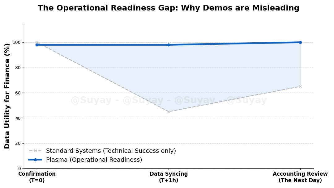 Figure 1: The Operational Readiness Gap. Visualizing the divergence between technical confirmation and financial utility. While standard systems require manual intervention to make data "accounting-ready," Plasma ensures information integrity from the moment of settlement.