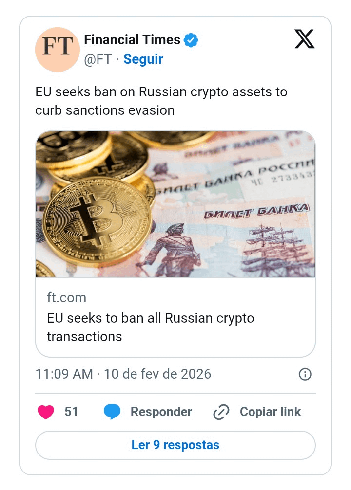 Nos papéis que o jornal teve acesso, tá escrito que a proposta é travar empresas e plataformas de cripto ligadas à Rússia de rodar na Europa. A Comissão Europeia acha que não adianta punir só algumas companhias, porque logo aparecem outras no lugar. Por isso, querem ampliar o cerco e bloquear qualquer serviço de criptomoeda que tenha ligação com o país.