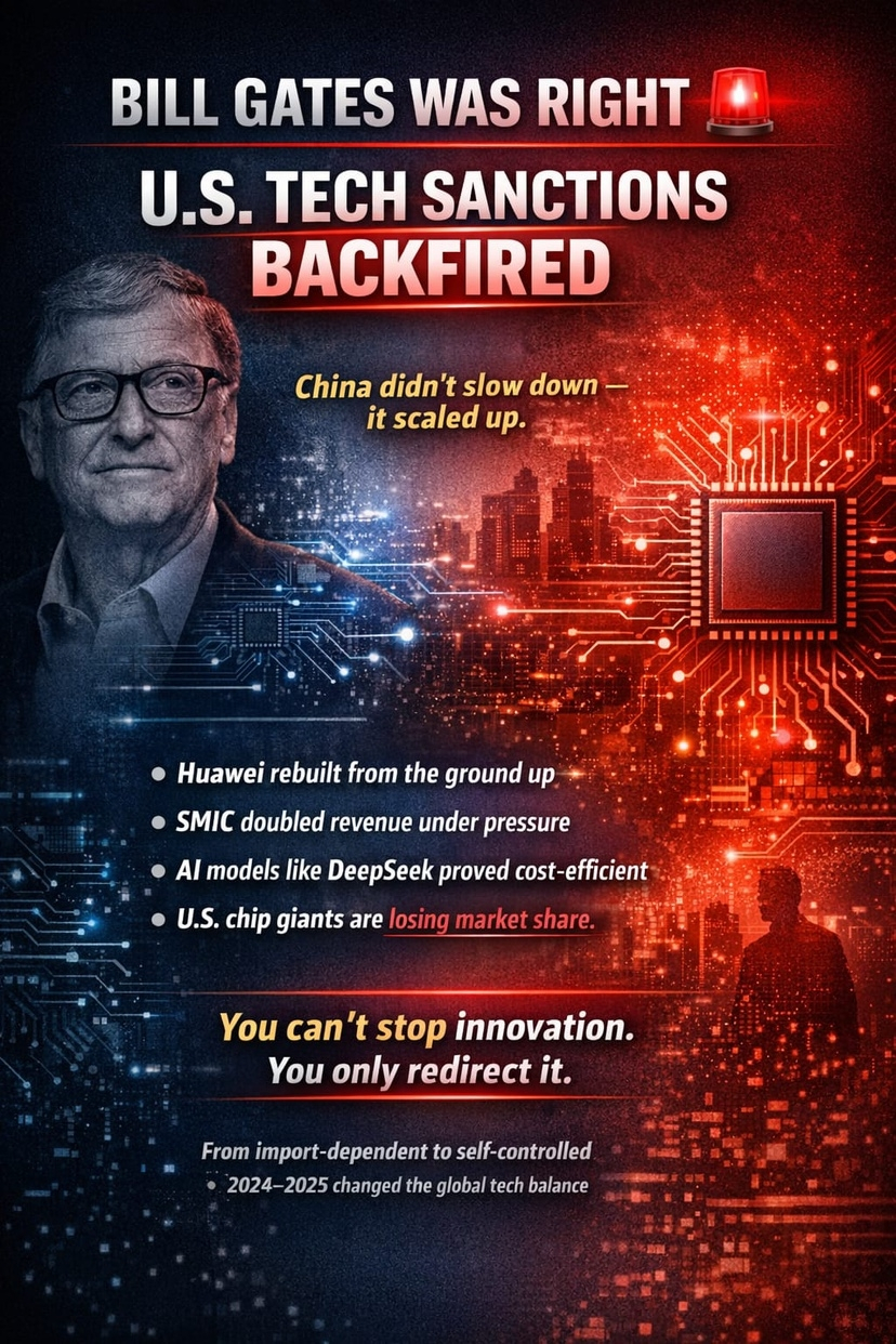 Years ago, Bill Gates warned that trying to suppress Chinaâs technological rise would do the opposite: force self-reliance, accelerate innovation, and break global dependencies. Fast-forward to 2024â2025, and the data proves him right.