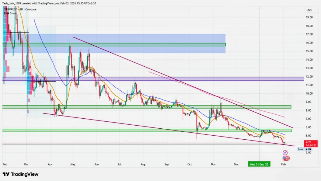 TRUMP exploded post-launch: Started at ~$6.50, hit $73+ in days on inauguration buzz, market cap topped $7B. Then crashed to $1.21 by mid-2025 amid market cools. In 2026 so far, it's hovered $3-5, down 80% yearly from peak but resilient for a meme. Key: Deflationary burns and community charity (vets) help scarcity, but politics drive 99% swings!