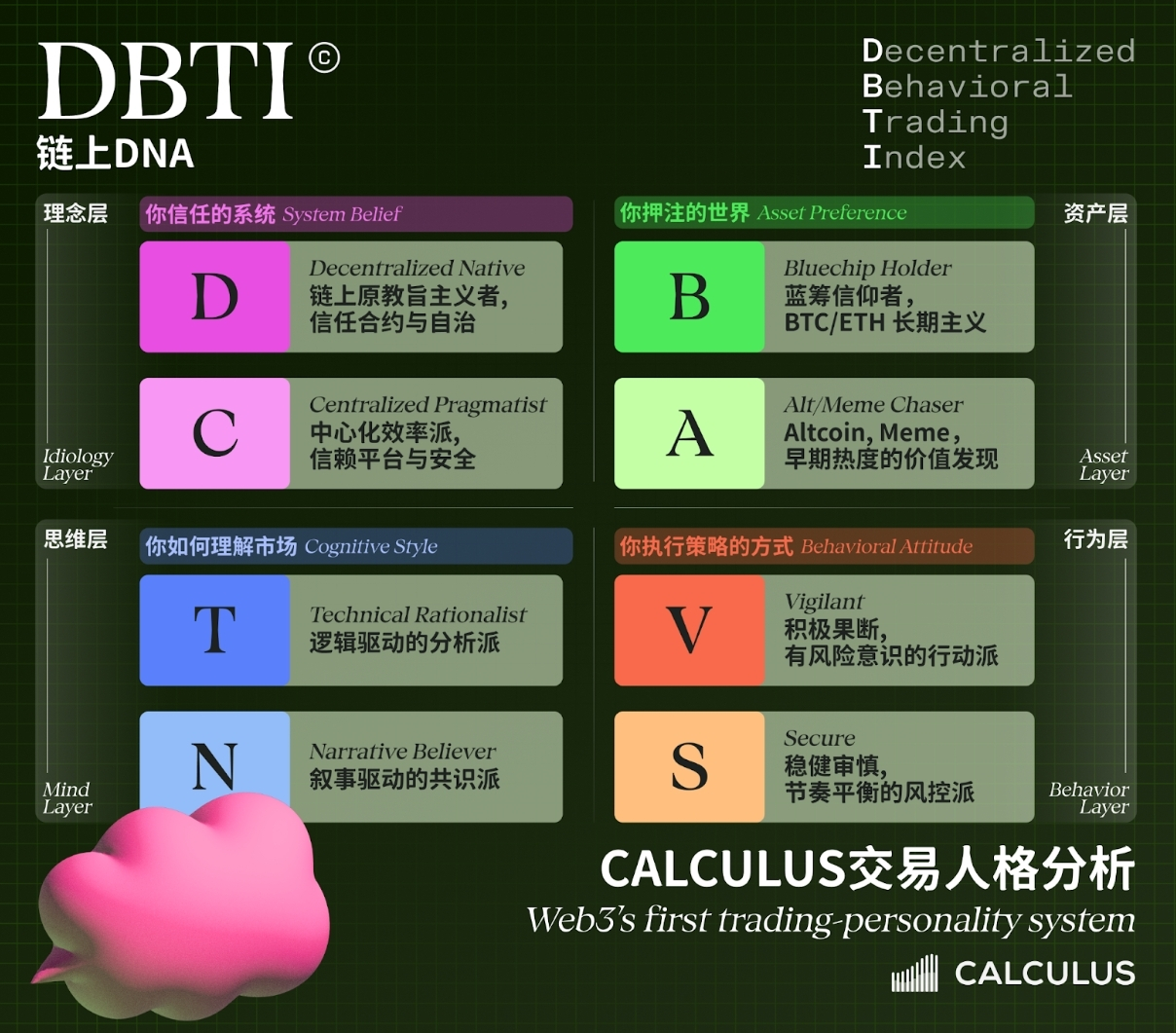 不同于传统心理学测试,Calculus Finance(https://x.com/CalculusFinance) 推动的 DBTI(去中心化交易人格系统) 采用的是非侵入式的数据挖掘模型: