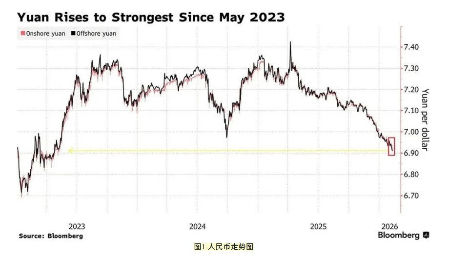 美元指数走弱背景下,人民币对美元即期汇率1月26日盘中最高升至6.9539,再度创下2023年5月17日以来的新高。在离岸市场上,离岸人民币对美元汇率1月26日盘中最高升至6.9445,创下2023年5月13日以来的新高。