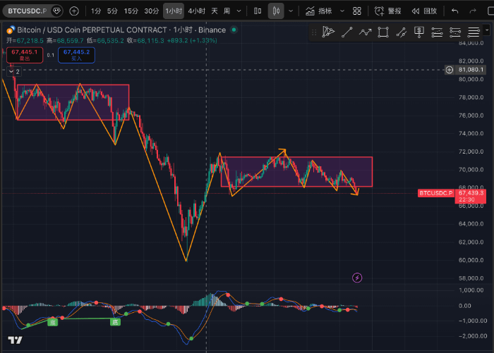 后面开始反弹,我本来以为能在7w坚持一段时间。想不到走势越来越弱:一是成交量在减少,二是震荡区间的高点越来越低,昨天更是跌破箱底,还好勉强拉了回来。