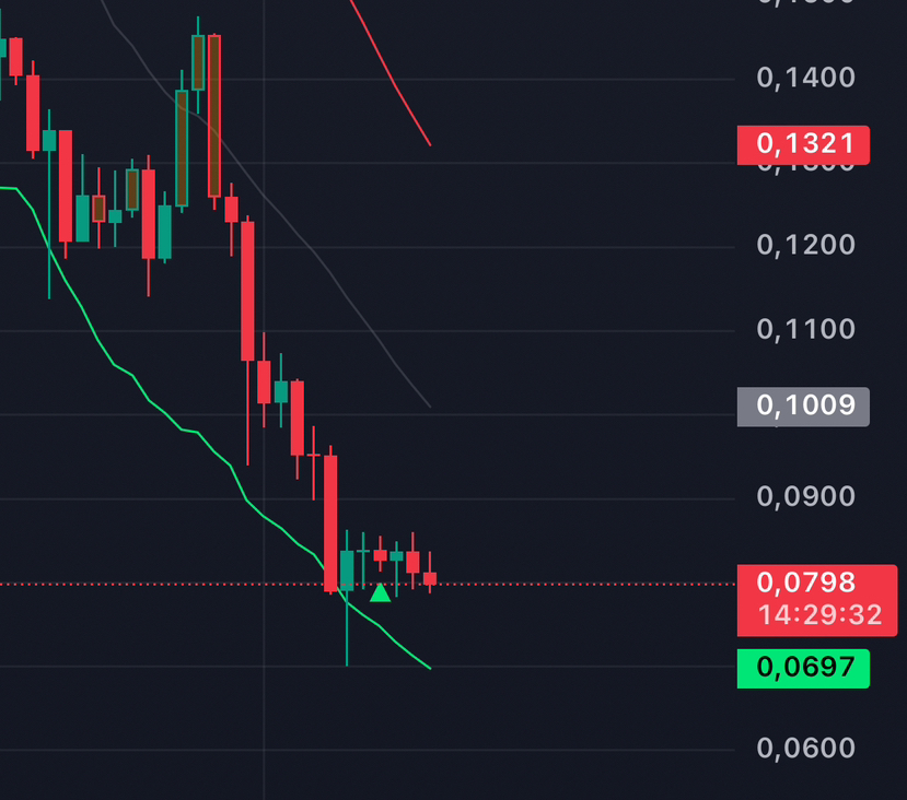 Забагато очікувань від L1-модернізації та AI-інтеграцій, але попит не встиг — як пружина, що довго стискалася на хайпі та раптово відпустила вниз. На чарті: пробиття $0.10, RSI на 28 (перепроданість), MACD медвежа дивергенція, але об’єм продажів спадає — класичний “вимах хвоста”.