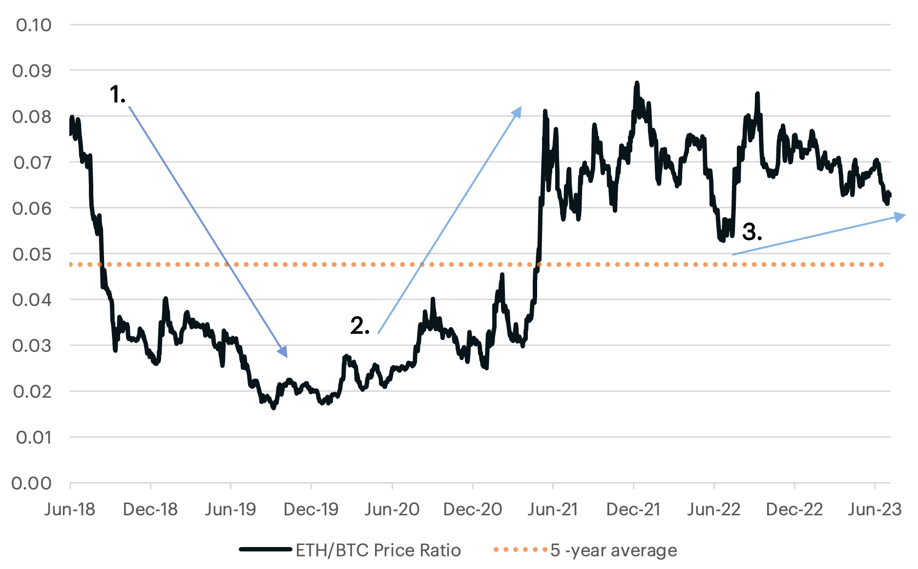 ETH/BTC ratio reclaiming 0.035–0.040 with volume