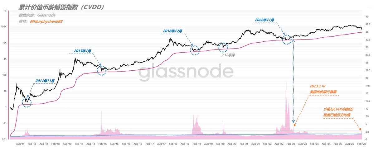 其最大的特点就是“从不回撤”,即今天的CVDD一定比昨天高。从2010至2026年,BTC每一天的价格都在CVDD之上;在熊市底部会无限接近,但从未跌破。包括2022年11月 $BTC 最低至$15,800,而当时CVDD是$14,800。