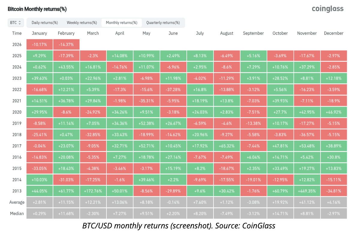 Metric2026Historical ContextFebruary return-14.4%3rd worst since 2013Previous worst-31.03% (2014)Followed by 12-month recovery2nd worst-17.39% (2025)Preceded new ATH