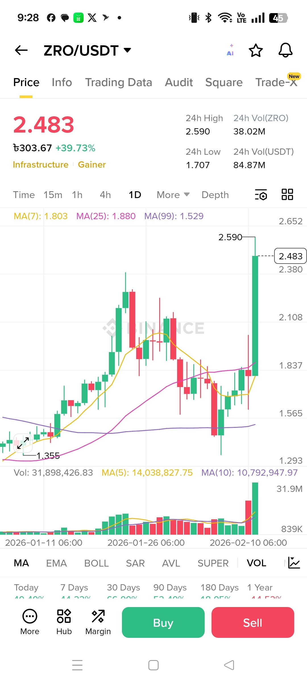 $ZRO (LayerZero) is showing a very clear bullish breakout on the daily timeframe. Price ripped higher from roughly 1.707 (the 24h low) up to around 2.483 (the level shown on the chart), which works out to an explosive ~+39.7% move in a single day. The surge also came with heavy participation, with roughly ~38M ZRO traded, which is exactly the kind of volume you want to see when a breakout is “real” and not just a thin-liquidity spike. In live pricing, #ZRO hovering around $2.45–$2.53 across major exchanges lines up with that same ~37–40% 24-hour expansion.