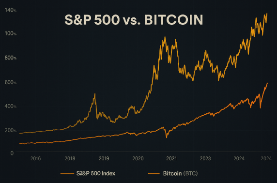 On one side, you have the S&P 500 â the backbone of traditional finance. It represents 500 of Americaâs largest companies, built on decades of earnings, regulation, and institutional trust. It moves steadily, often reflecting economic cycles, interest rates, and corporate performance. Itâs the marathon runner of wealth building.