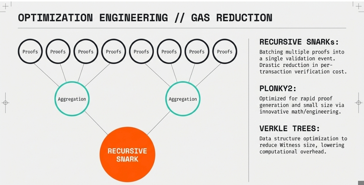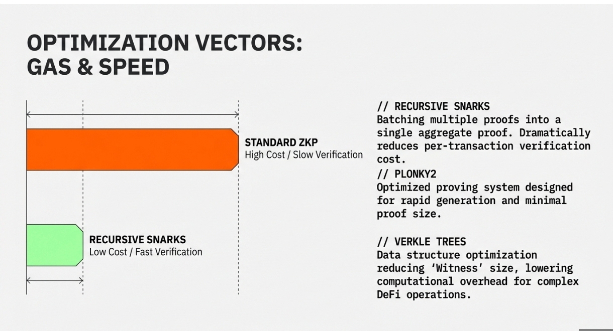 Verkle trees and other advanced data structures help reduce the witness size required for proofs. Smaller witnesses mean less data needs to be processed during proof generation, lowering computational requirements and gas costs. These optimizations are particularly important for complex DeFi operations that involve multiple steps or conditions.