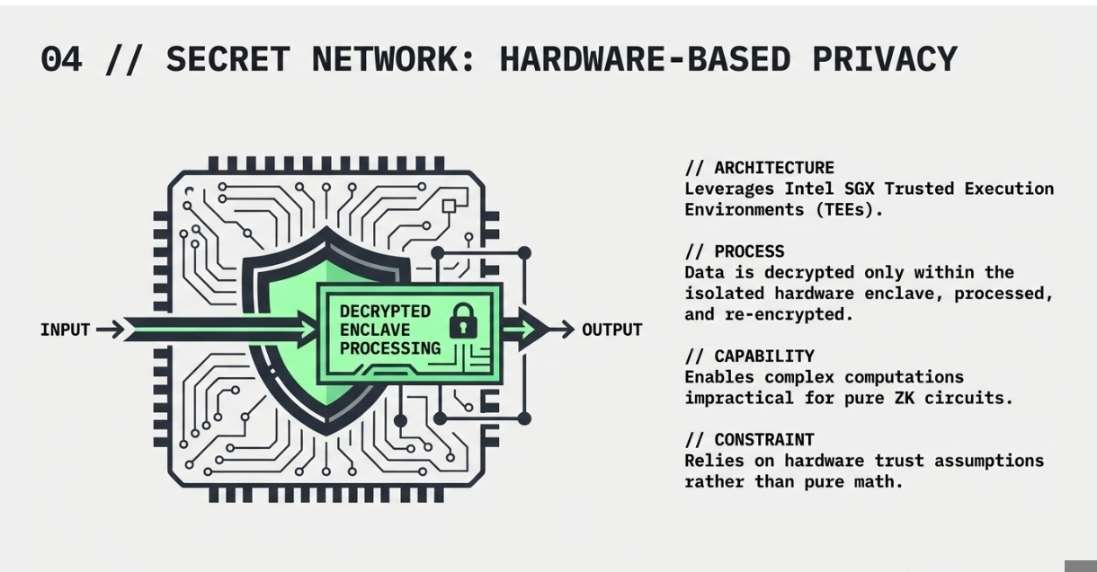 Secret Network implements privacy through Trusted Execution Environments (TEEs), specifically using Intel's SGX technology. TEEs create secure enclaves within processors where code can be executed in isolation from the main operating system, protecting it from observation or tampering.