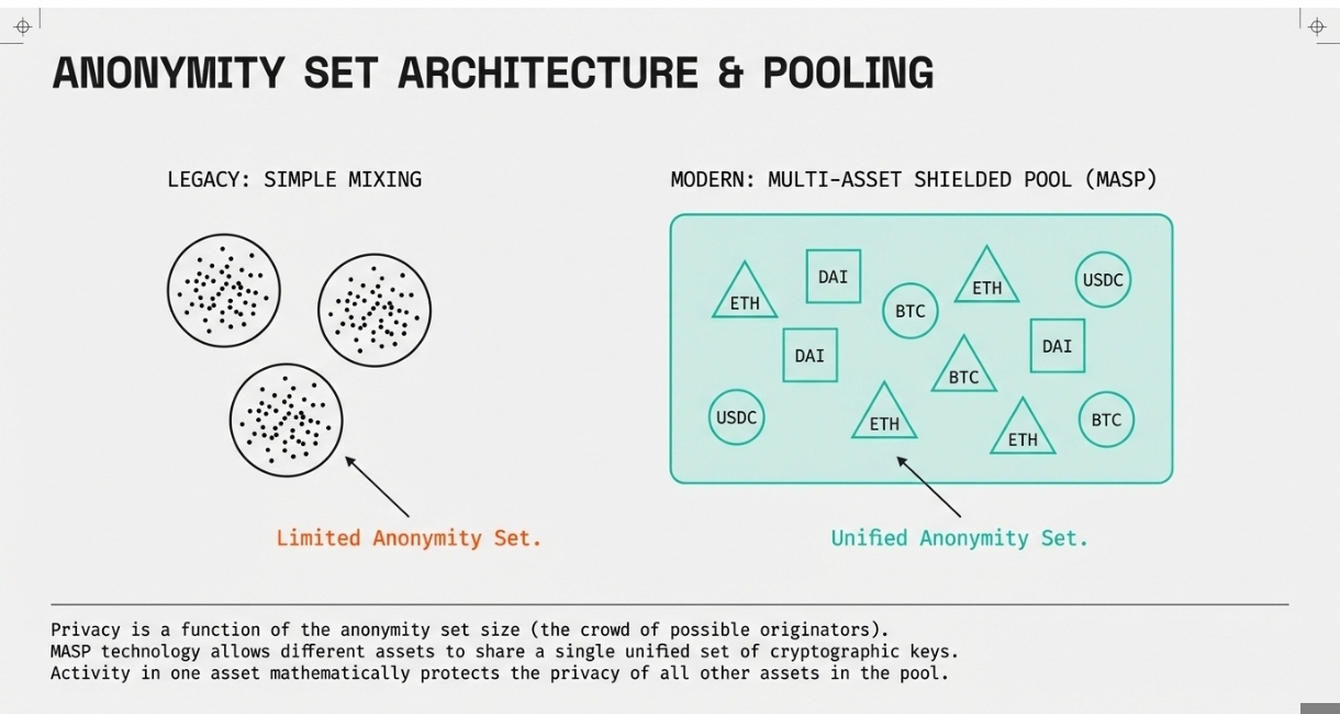 The protocol uses a unified set of cryptographic keys for all assets within the shield pool. This design means that activity with one asset contributes to the anonymity of all other assets in the pool. The larger combined anonymity set provides stronger privacy guarantees than would be possible with separate single-asset pools.